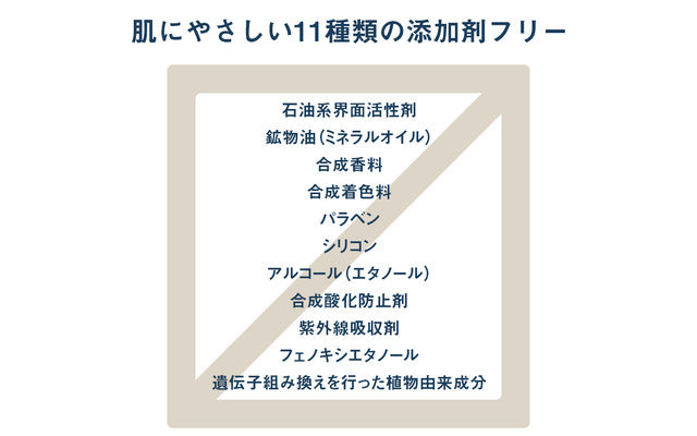 また、男性化粧品で比較的多く配合されているエタノールや、合成界面活性剤などの添加剤を11種類を排除し、肌に必要な成分だけを厳選して配合しております。