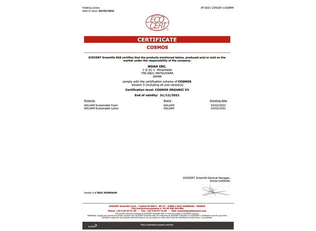 本製品は、フランスのトゥールーズに本拠を置く有機認証機関のエコサート社と契約し、COSMOSオーガニック認証を取得しました。